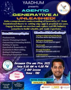 Yaadhum presents “Agentic Generative AI Unleashed” Up Next from Yaadhum – A Sensational Session You Can’t Miss!AGENTIC GENERATIVE AI UNLEASHED!Ready to stop hearing about the future and start building it?Join Jothi Read More & Register » February 27, 2025 No Comments